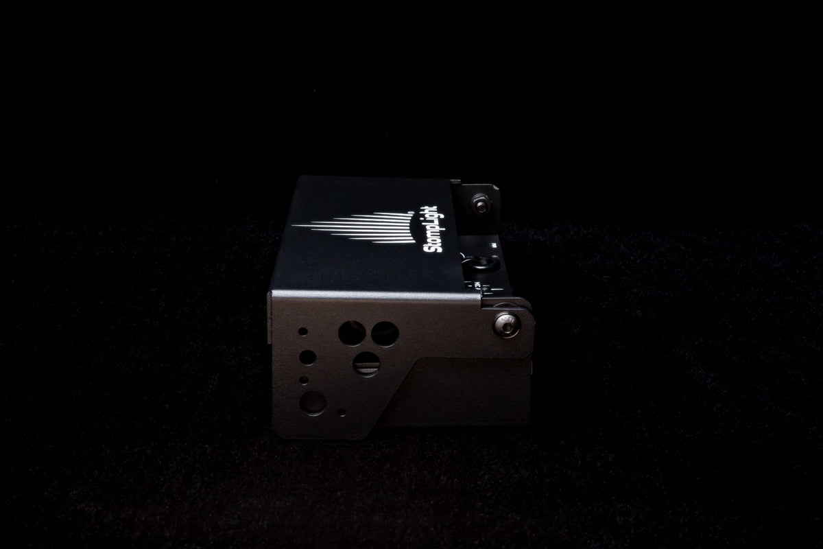 StompLight goes from gig bag to stage in seconds providing industry standard lighting effects that include color wheel, stroboscopic and sound responsive modes, all with the tap of a foot. StompLight’s rugged metal enclosure opens like a clamshell combining exceptional ease of operation and durability.
